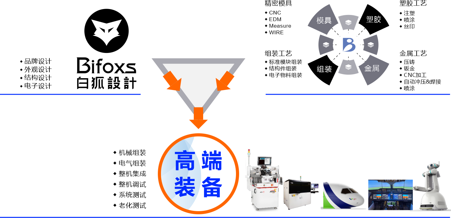 高端裝備是指在特定領域內具有先進技術、高性能和高附加值的產品。這些產品通常是應用于各種工業、科研、國防等領域的設備和系統,具有較高的技術門檻和市場競爭力。如數控機床、半導體設備、航天航空設備、高速列車、大型數控機器人、醫療影像設備、智能制造系統等等。 2020年8月,白狐設計公司和銀寶山新公司各自抽調了精兵強將,在東莞橫瀝銀寶山新灣區制造基地,組建了高端裝備事業部,專門聚焦于高端裝備領域,為客戶提供從設計研發、生產制造、組裝測試等一站式的JDM服務。